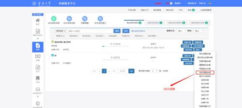 4. 进入项目组成员,请确认成员是否完整。特别是项目中有学生的参与的,请完善学生身份类别。成员信息有问题的,进入科研系统永利皇宫娱乐城,左侧的项目界面,点击操作下拉框下的成员调整申请,进入成员调整界面进行添加和修改,待项目主管审核之后,会自动补充到项目经费公开一览表,最后再提交即可。