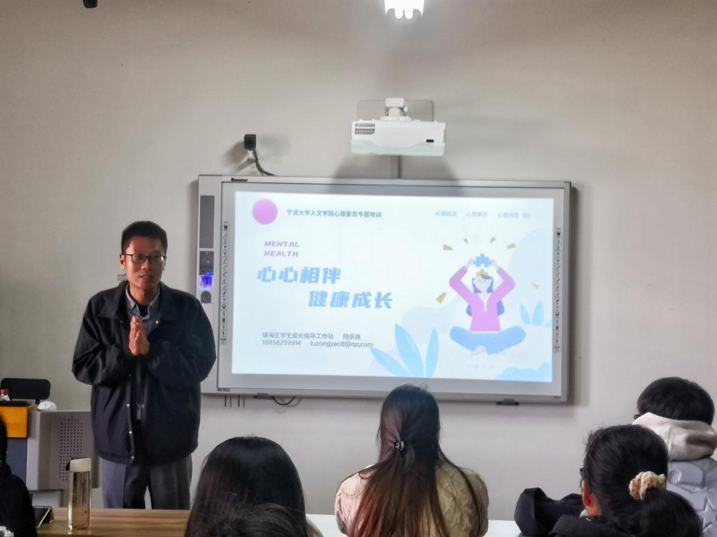 为更好地提升心理委员的工作能力,普及心理健康知识,发挥心理委员在班级中的积极作用,提高朋辈心理自助、互助的意识和能力,2023年11月21日中午,人文与传媒永利皇宫网 邀请镇海职教中心副校长、镇海区学生成长指导工作站首席导师、永利皇宫网 心理系兼职硕士生导师陆宗尧为永利皇宫网 全体心理委员做“心心相伴 健康成长”的主题讲座。永利皇宫网 党委副书记孙文静、学工办主任李洪伟一同出席。