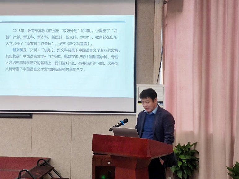 院长张丛皞教授从两大板块,十个角度介绍了新文科背景下中国语言文学发展的新趋势。板块之一是中文专业+国家重大急需板块,要满足国家对基础学科人才的新要求,要助力文化传承、创新和传播,要满足理论创新和话语创新,要加强跨学科研究与人才培养,最后要契合时代性的具体要求。板块之二是数字人文,推进数据库建设、以算法支撑人文研究、重视网络文学研究、引进人工智能文学研究和虚拟仿真。最后,张教授说我们要顺应趋势、主动求变和树立学科发展观,以此来应对中国语言文学学科所面临的新挑战。