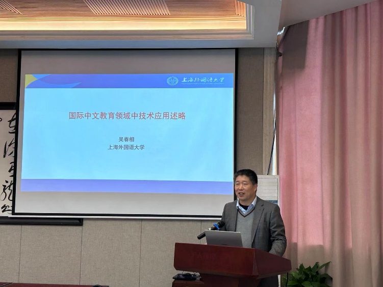 上海外国语大学吴春相教授以“国际中文教育领域中技术应用述略”为题,梳理了在元宇宙、ChatGPT等新概念、新技术出现的背景下,网络技术对国际中文教育的重要性、国际中文教育利用的各类新技术及其特点,如对知识点的细化和精准教学等,并展望了未来技术在教学中的应用。