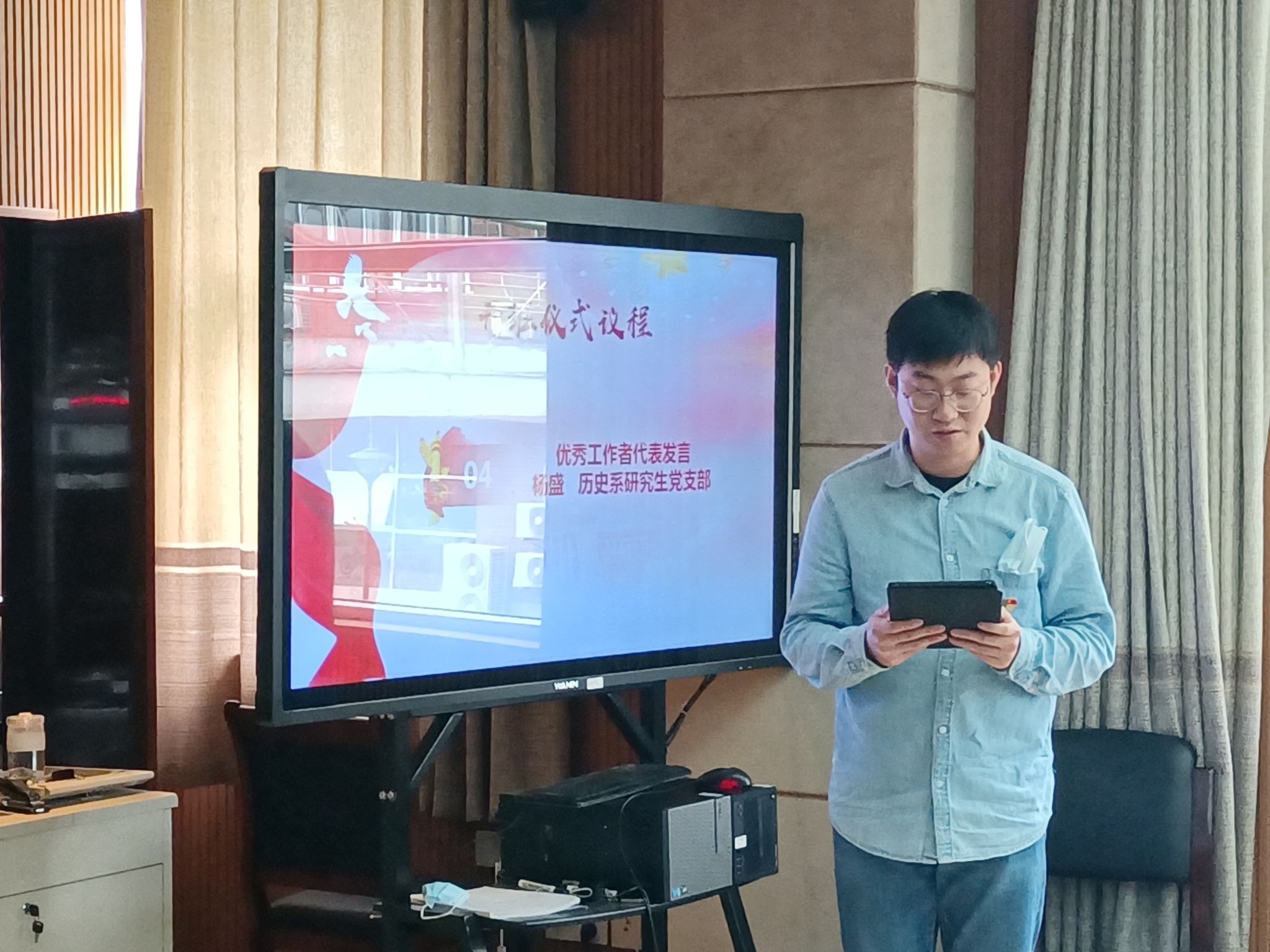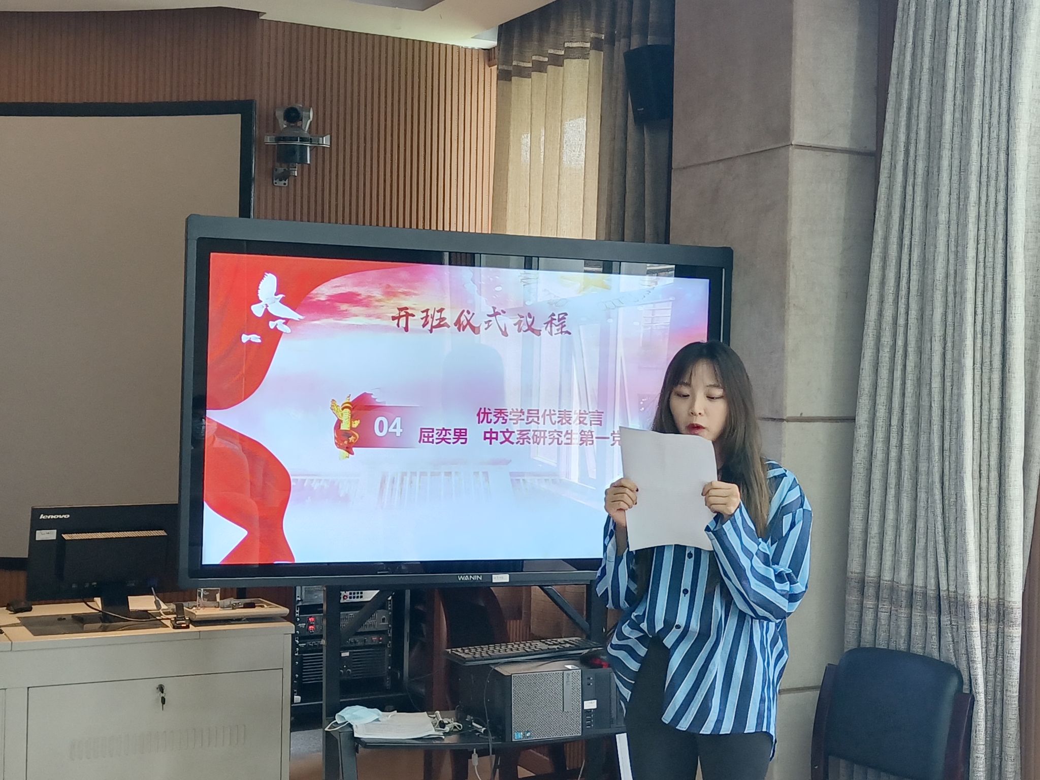 首先,分党校班主任介绍本次分党校培训班情况。本次培训班共有121名学员,包括42名入党积极分子,27名发展对象和52名预备党员。叶倩老师结合党校培训期间开展的课程学习、实践项目、小组自学等学习情况进行了总结汇报。