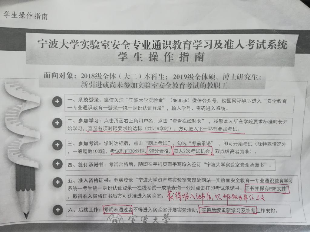 学习和考试均在网上系统操作,学生须在上述规定时间内登录“系统”,参加学习,在学习时间达标后,方可参加考试,考试合格后,签订“实验室安全承诺书”、而后下载保存“实验室安全承诺书”、“实验室安全准入合格证书。” “实验室安全准入合格证书”须打印交给班长,统一上交至永利皇宫网