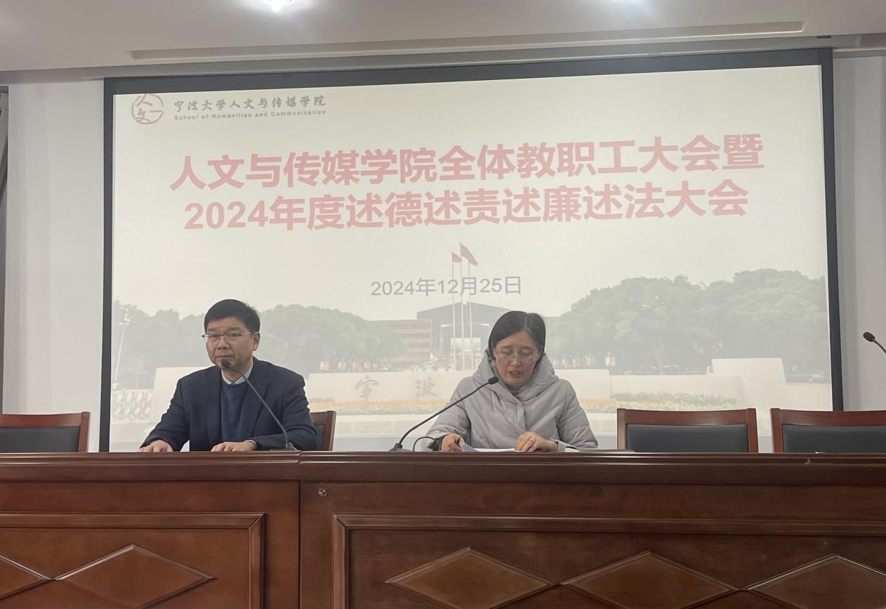 12月25日,人文与传媒学院2024年度述德述责述廉述法大会在包书书科学楼10号楼209报告厅举行。会议由院党委书记张佩芬主持,院党政班子成员及全体教职工参会。