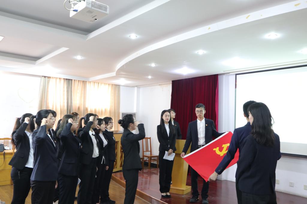 在全场师生高唱国歌举行了鲁斯涵、王佳妍、傅苗燕、顾苗央、李一秀、李超娜、胡佳春、张惠芝、丁璐9名新党员的入党宣誓仪式,她们用自己的庄严宣誓,表达了加入中国共产党的坚定决心。支部指导老师汪盛科为新党员颁发喜报,向她们表示热烈祝贺。