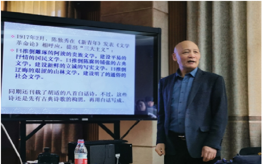 黄教授主要围绕“古与今的区分”、“关于诗歌演变的问题”、“为何要强调诗歌古今演变研究”、“如何进行研究”四个方面展开,并针对下分的几个重要问题进行了详细的论述。“通变”、“时序”是中国文论中关于文学发展、文学与时代关系的两个重要关键词,黄教授带领大家有体系地串联线索,利用翔实的文献资料理解诗歌发展的文学思想内涵,重点阐发了刘勰《文心雕龙》文学思想和近百年来学术界的研究现状。最后,黄教授强调现今学科发展的一些困境,鼓励大家跳出之前研究的老路子,勇敢创新,用新的研究思路、研究方法跨越学术研究的壁垒。同时,他对当代诗词史的学科发展作出了展望,呼吁古代文学与现当代文学师生进行跨学科交流研究。