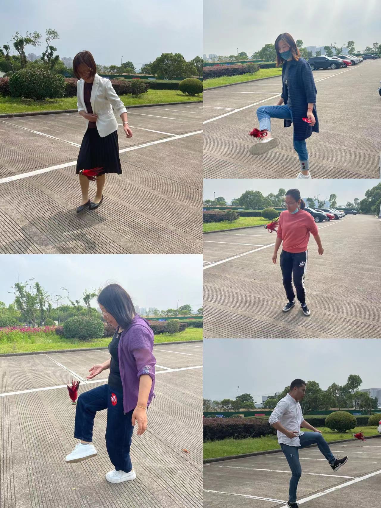 踢毽子大概是在场选手最大的挑战了。有不少老师和同学都说,自己在小学时还能连续踢200个毽子,到了大学竟全然忘了。因此现场也时不时会出现选手之间相互传授踢毽子小技巧的场面,画面温馨。看着一个个毽子高高抛起,有那么一瞬间觉得回到了自己的孩童时代。从一声声“我曾经……”中,我们也发现童年掌握的技能即使在平时被悄然遗忘,师生趣味运动会帮助老师、同学寻回童年的文体技能,进一步挖掘老师同学们身上被书香气隐藏的才艺亮点。