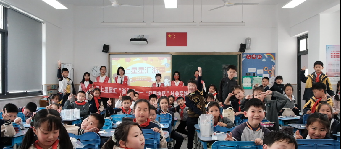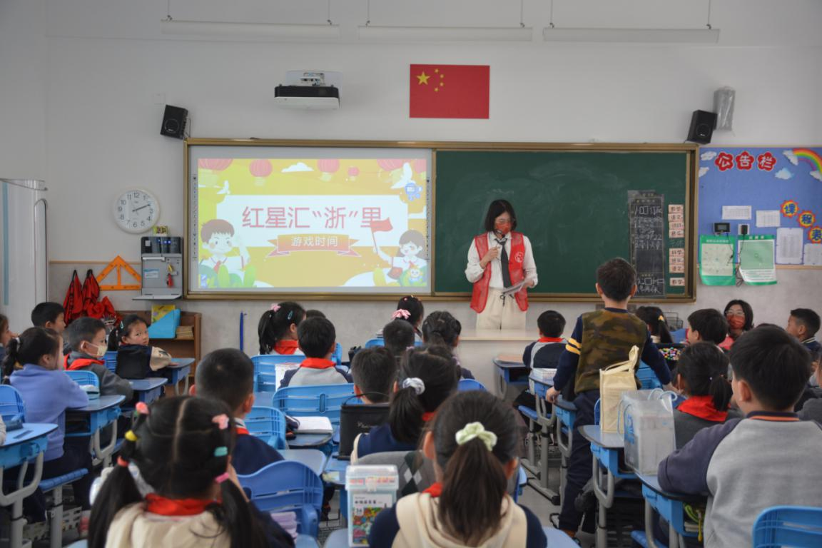 小学部二年级(13)班中采用动画视频引入、折五角星、学唱红色歌曲、分发党史文创产品等方式进行。宣传团队带着年轻又充满活力的小学生们一步步了解浙东党史,增强了学生对浙东革命者立体形象的认识,提升了学生对党史学习的兴趣。活动中,宣传团队还就党史学习、活动体验等方面,与学生展开了感想交流。