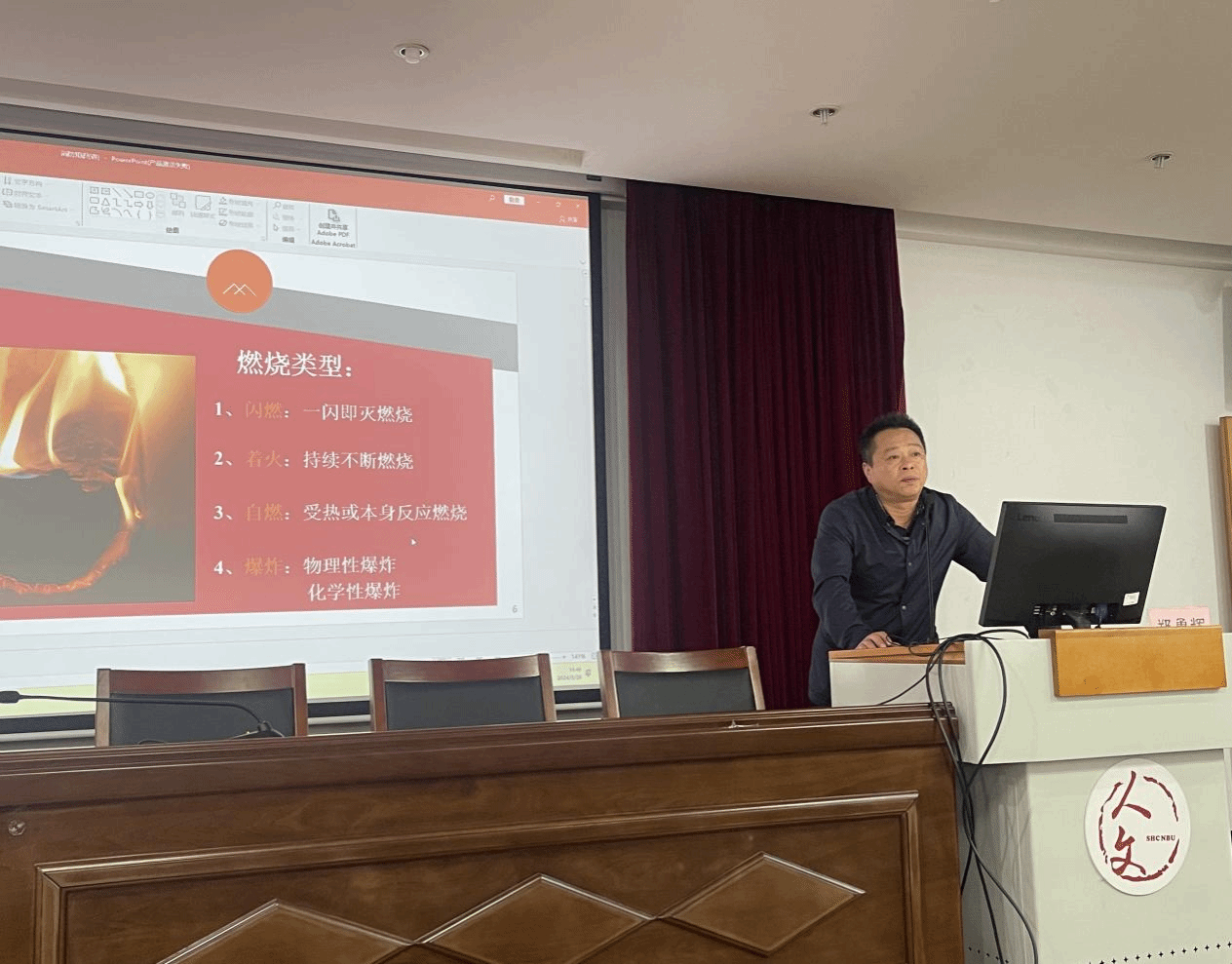 的师生进行消防安全教育,介绍防火灭火的常识。他围绕校园火灾特点和危害,用通俗易懂的语言向师生讲述校园起火原因、如何正确拨打119报警电话及火场逃生自救技巧等消防安全知识。