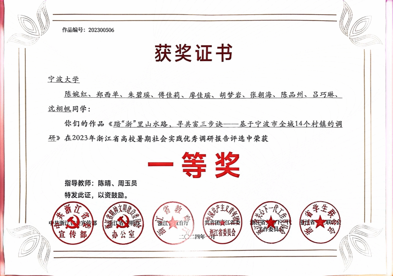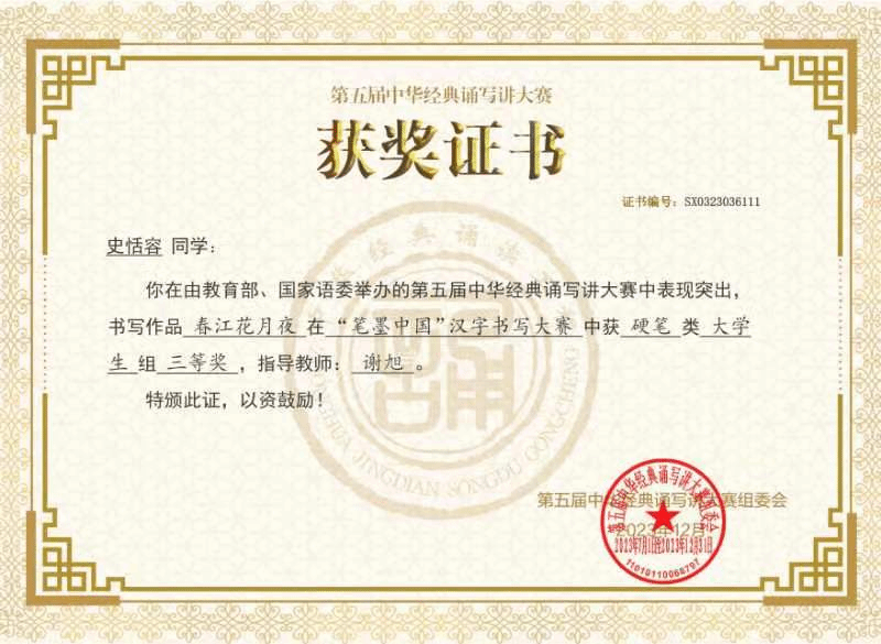 第十七届师范生教学技能竞赛优胜奖,2024届章韵檬同学获浙江省第十一届大学生中华经典诵写讲大赛“诗泽之江”诗词讲解竞赛一等奖。