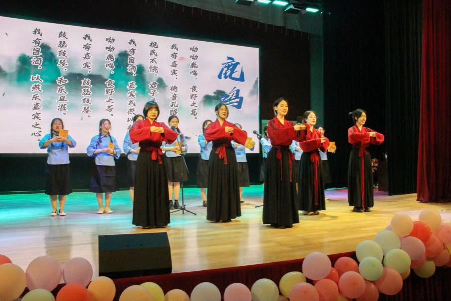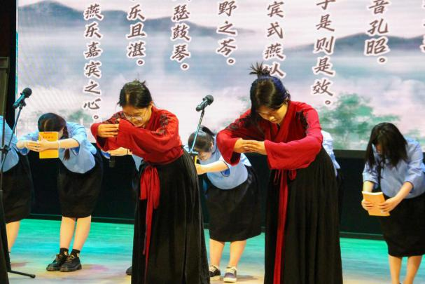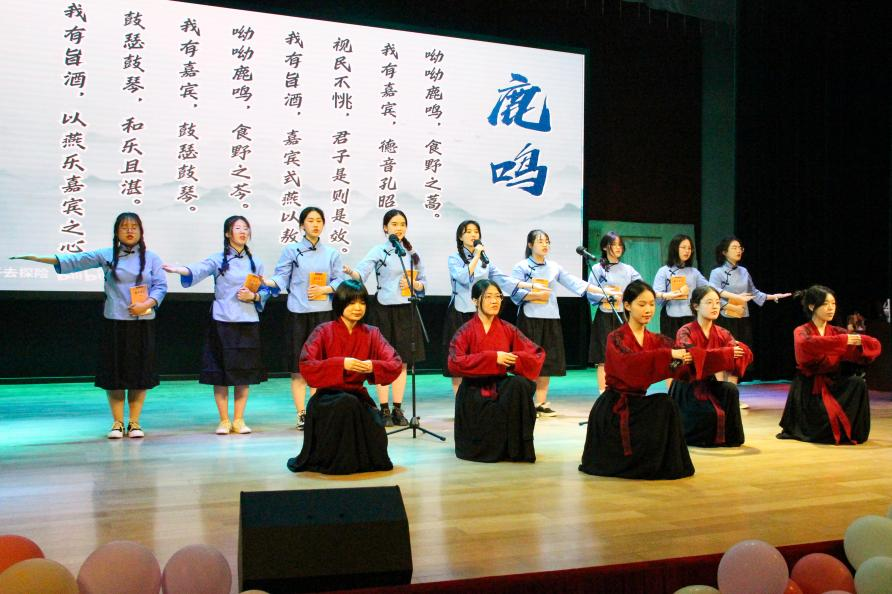 “乐鸣”吟诵团的首次亮相。从第一次排练到如今登台演出,过了半月有余。在老师们的悉心指导下,团员们齐心协力设计动作、编排队形,将《鹿鸣》尽力演绎完美。虽然过程艰辛,但在练习中队员们彼此熟悉,对诗文本身有了更为深刻的理解。与此同时,在排练的过程中我们也收获了“美育”教育,我们在诗意与远方中探寻中华文化基因,在生活之美中感受浓厚的情怀,重现礼仪之邦,寻找到我们文化的“初心”。